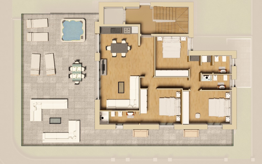 Composto da salone di oltre 33 mq con cucina living con affaccio su esclusivo terrazzo di oltre 100 mq, nella zona notte 3 letto: una matrimoniale e due camere doppie e 3 bagni, completa la proprietà un posto auto .